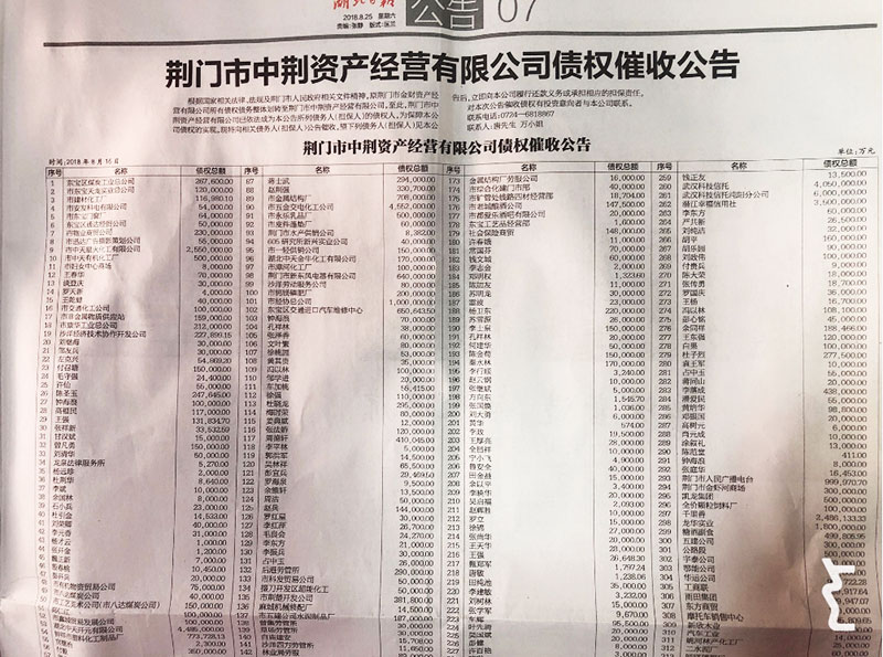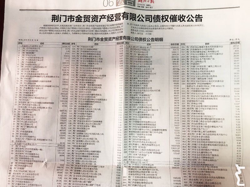 根據(jù)國家相關(guān)法律、法規(guī)及相關(guān)部門文件規(guī)定,為保障我公司債權(quán)的實現(xiàn),市中荊資產(chǎn)公司于2018年8月25日在湖北日報分別刊登了《荊門市金貿(mào)資產(chǎn)經(jīng)營有限公司債權(quán)催收公告》和《荊門市中荊資產(chǎn)經(jīng)營有限公司債權(quán)催收公告》。通過媒體來催收債務(wù),有利于形成輿論監(jiān)督,督促債務(wù)人履行債務(wù),也有利于社會誠信體系的建立。